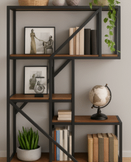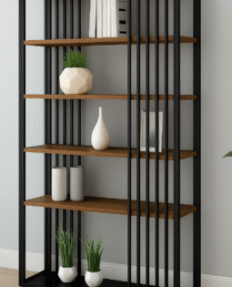 Diseño sofisticado y funcionalidad premium. La Biblioteca Moderna en hierro y madera de pino organiza con elegancia y estilo contemporáneo.